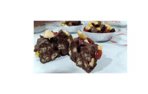 Celebrate the season with Cocoa Noël, crafted from crunchy homemade KitKat cubes coated in smooth dark chocolate. The festive mix is finished with a beautiful topping of citrus peel, cranberries, and hazelnuts, adding brightness, sweetness, and a satisfying crunch. A joyful holiday treat perfect for sharing or gifting. Suitable for vegetarian.